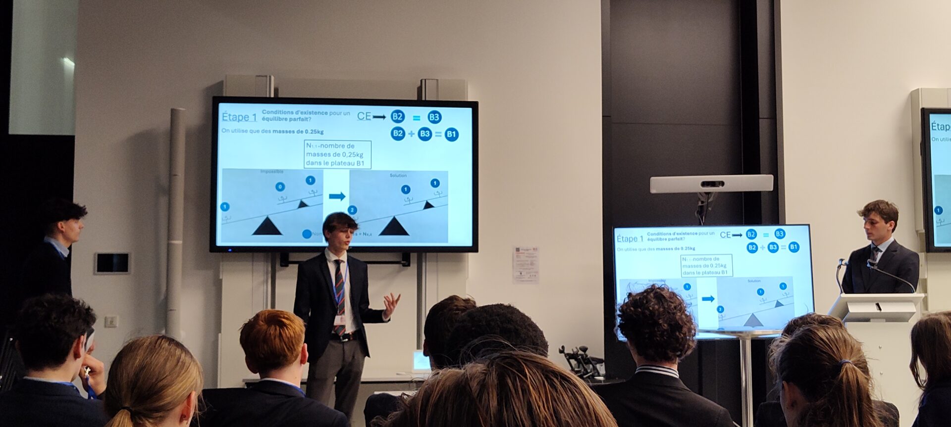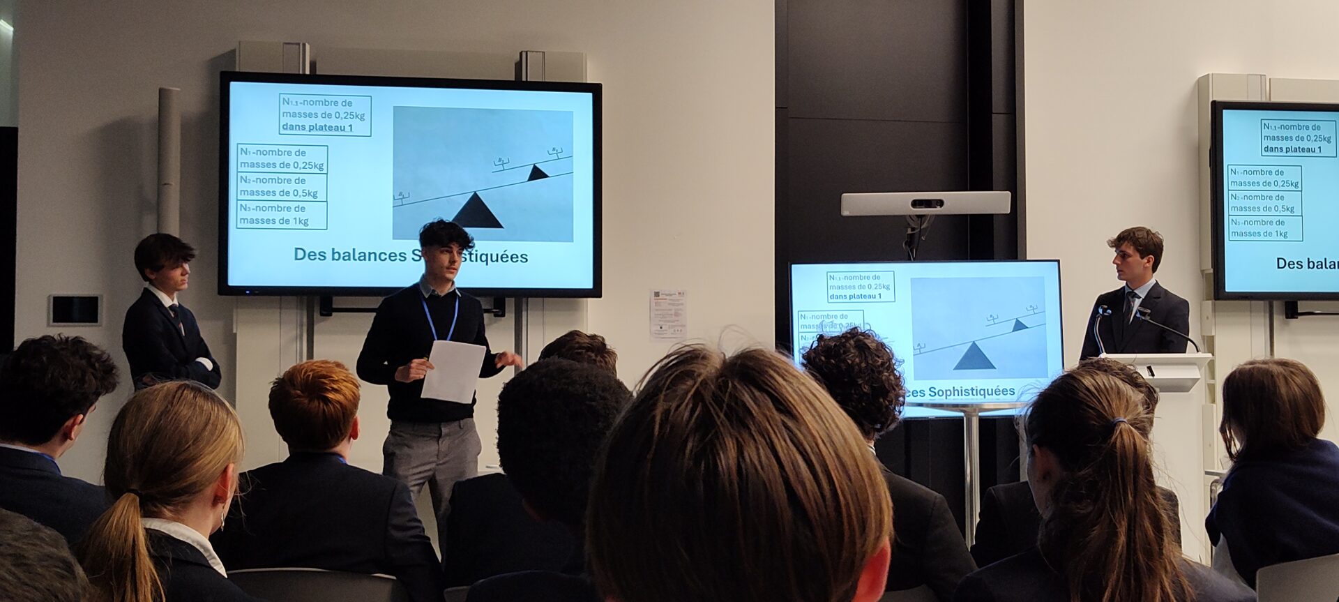 Ensuite, Vic, Noah et Vincent ont présenté “Des balances sophistiquées”, un projet qui intègre algèbre et optimisation pour aborder des problèmes de pesage. Leur méthode a encouragé des échanges enrichissants parmi les participants, mettant en lumière la capacité des étudiants à aborder des questions mathématiques pertinentes.