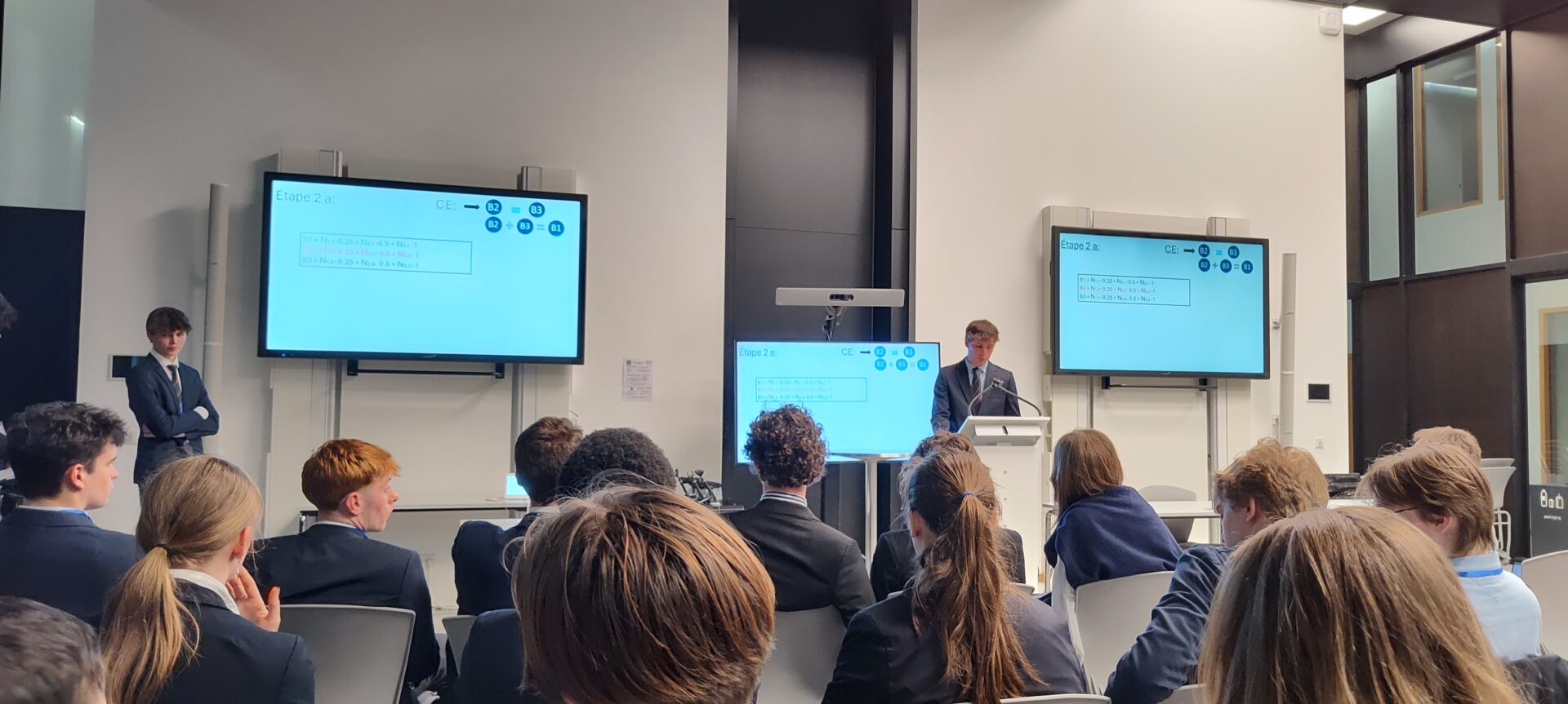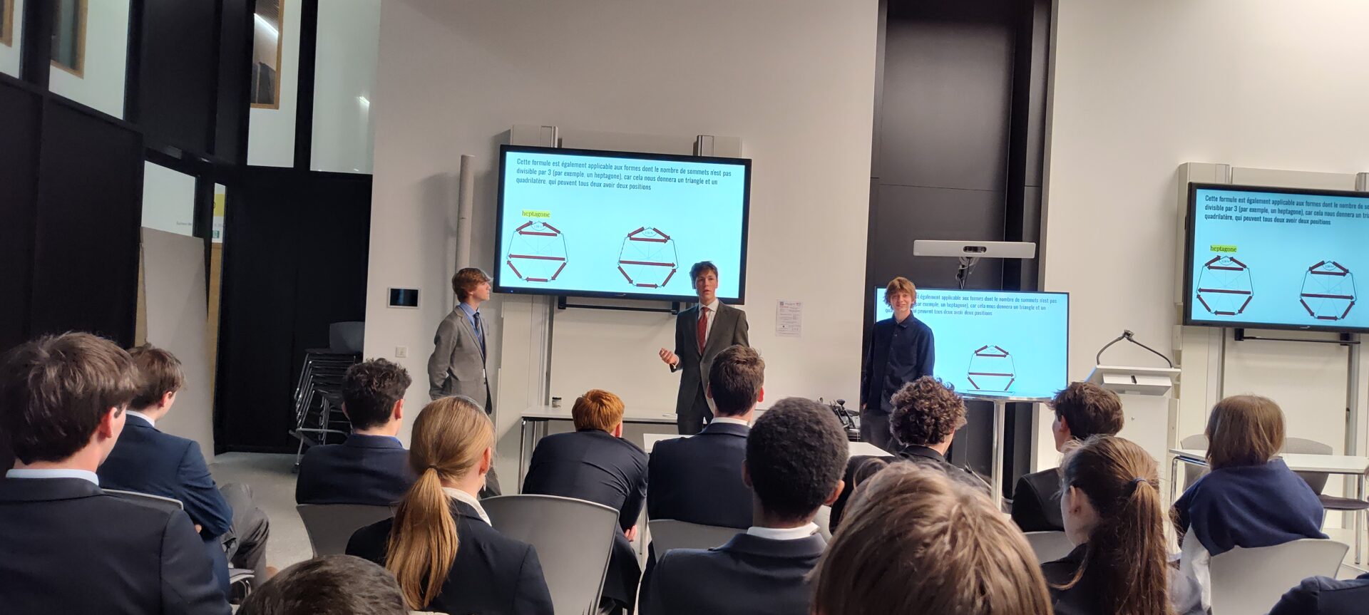 Nos professeurs de mathématiques, Hélène Gatellier et Miguël Dhyne, ainsi que les chercheurs Jean-François de Kemmeter et Justine Bodart de l’Université de Namur, ont accompagné les élèves dans la préparation de ces présentations.