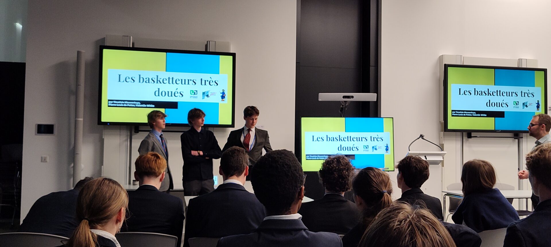 Deux groupes d’élèves ont présenté leurs projets. Timothée, Valentin et Pierre-Louis ont exposé leur projet “Des basketteurs très doués”, une étude qui combine géométrie et analyse combinatoire pour explorer des stratégies dans le basketball. Leur travail a montré une bonne compréhension des concepts mathématiques et une application pratique intéressante.