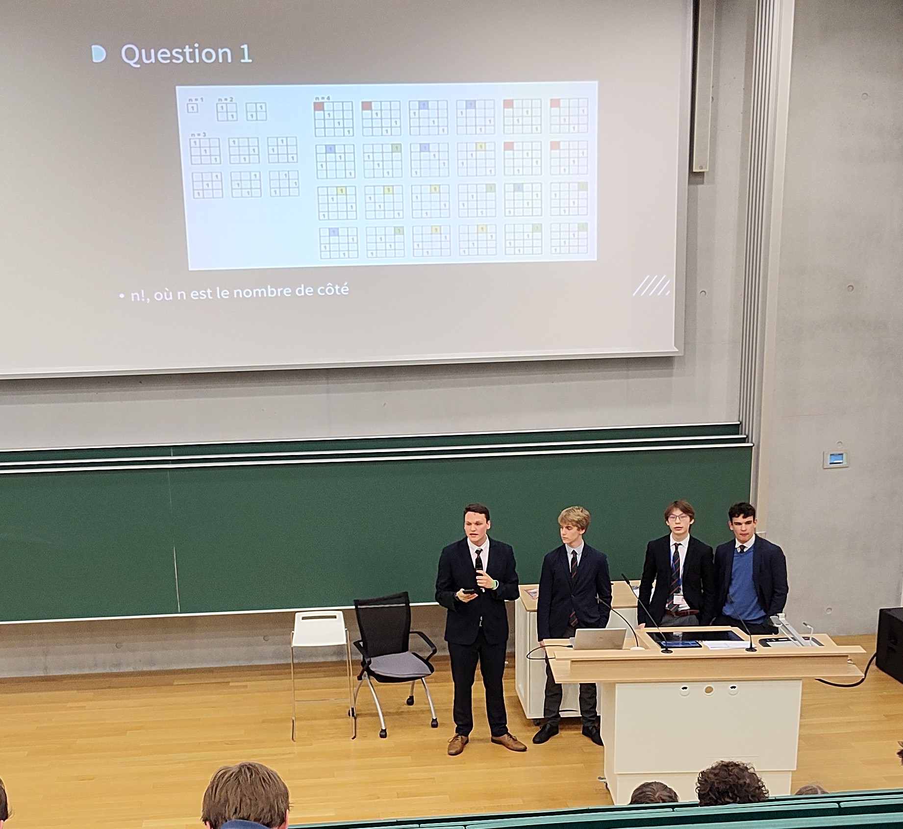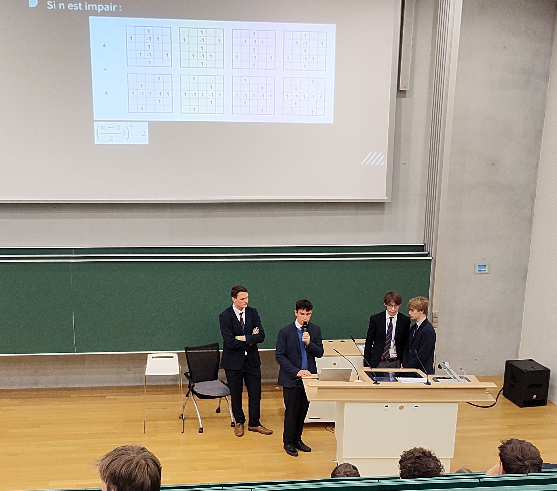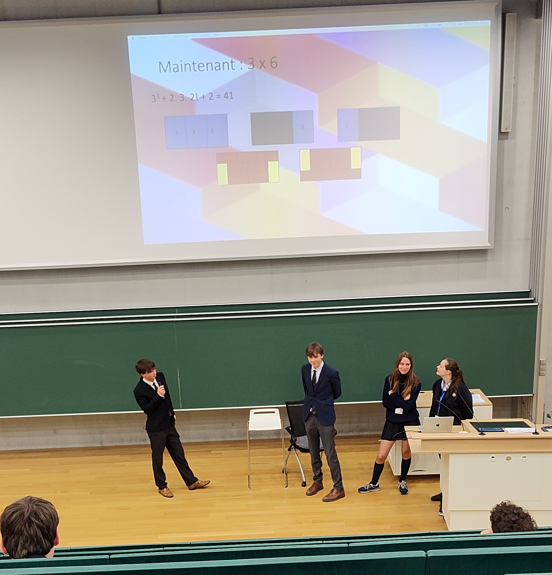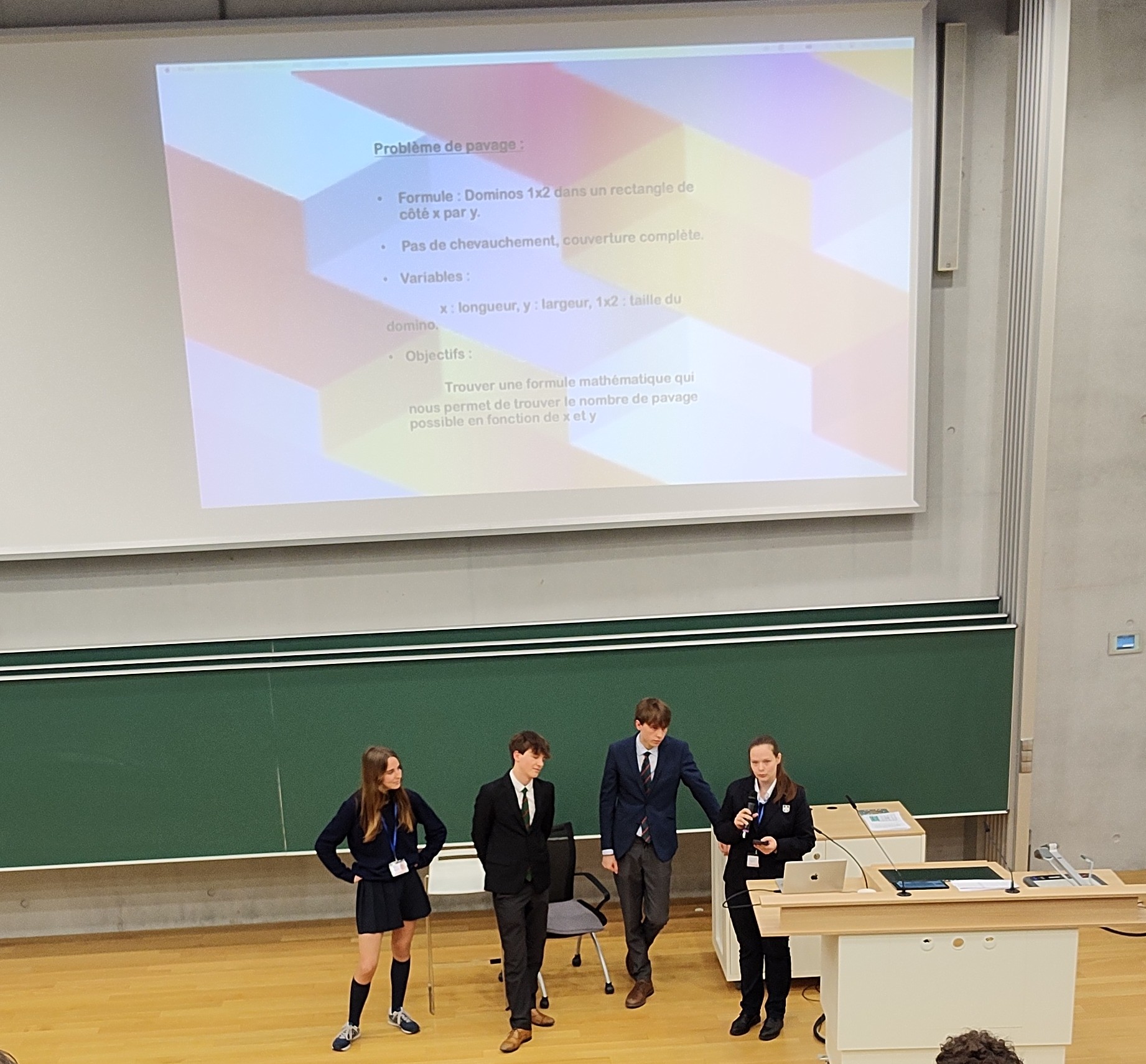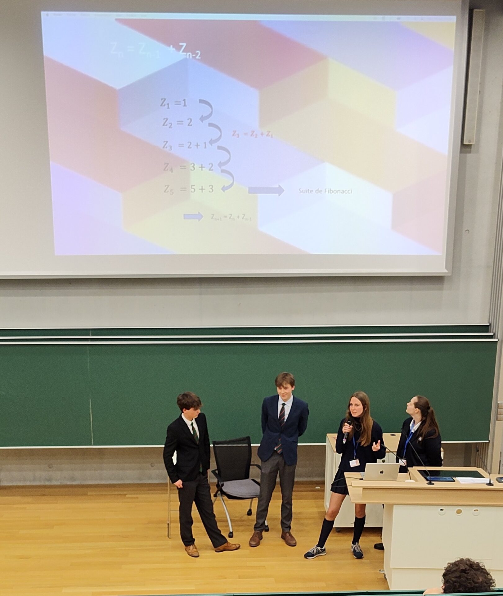 Nos professeurs de mathématiques, Hélène Gatellier et Miguël Dhyne, ainsi que les chercheurs Jean-François de Kemmeter et Justine Bodart de l’Université de Namur, ont accompagné les élèves dans la préparation de ces présentations.
