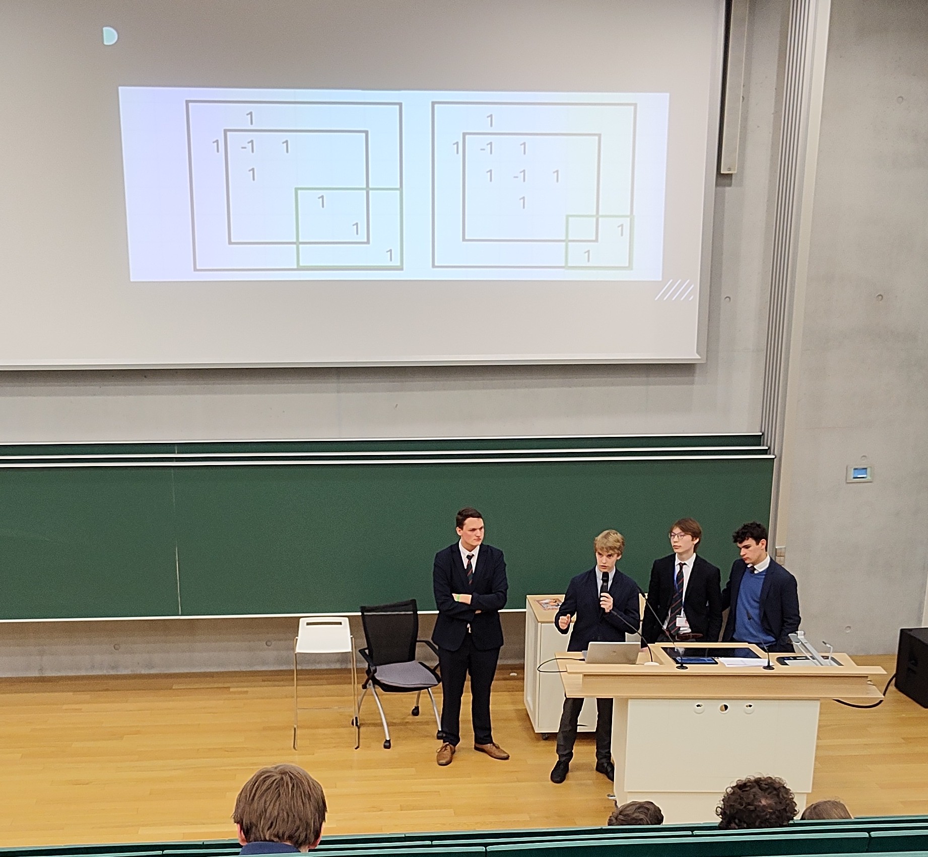 Arthur, François, Timour et Yanis ont exposé “Des tableaux pas comme les autres”, intégrant algèbre et analyse combinatoire pour créer et analyser des structures de données complexes. Leur travail a illustré une façon de conceptualiser et résoudre des problèmes mathématiques.