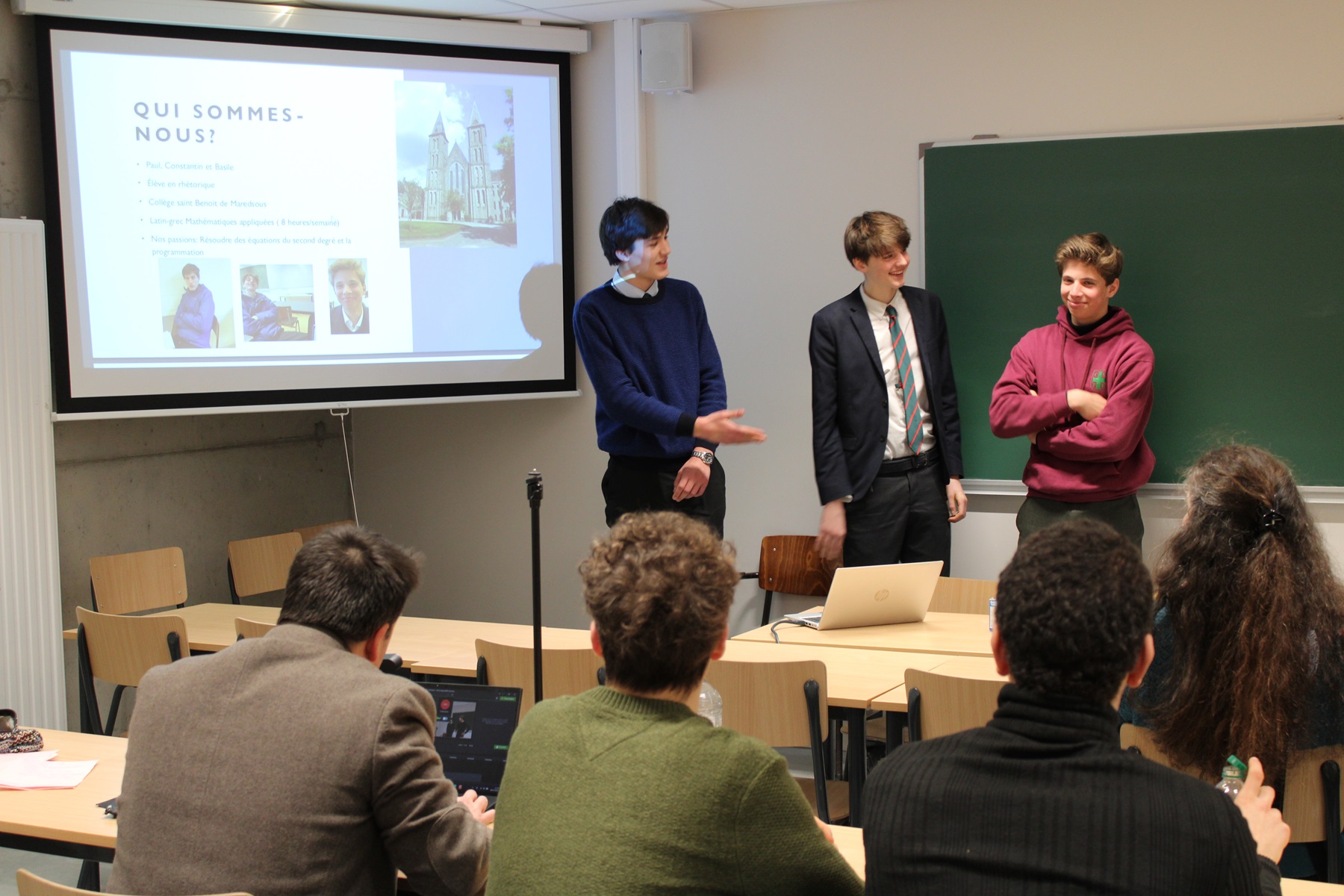Le mardi 28 janvier 2025, les rhétoriciens du Collège Saint-Benoît de Maredsous ont présenté les premiers résultats de leurs projets de recherche dans le cadre de Math.en.Jeans devant les Professeurs et chercheurs du Département de Mathématiques de l’Université de Namur.