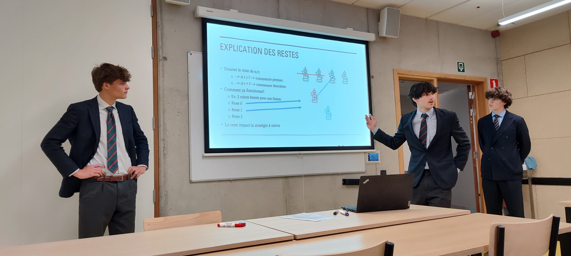 Félix Laloux, Harold Bouvy et Arnaud Gotta ont fait part de leur recherche à propos d’Un jeu de stratégie mathématique : la fabrique mystérieuse de robots. Une plongée dans l’univers des stratégies logiques et des défis mathématiques, où chaque décision compte.